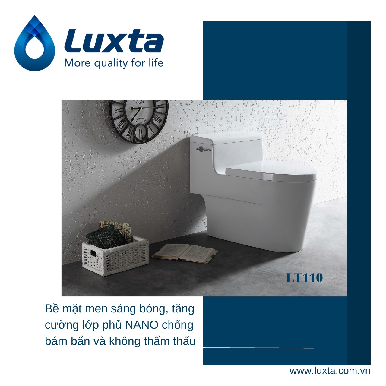 Bàn cầu 1 khối Luxta thiết kế bên ngoài sáng bóng từ vật liệu sứ trắng và phủ NANO, giúp bề mặt luôn bền đẹp trong thời gian dài