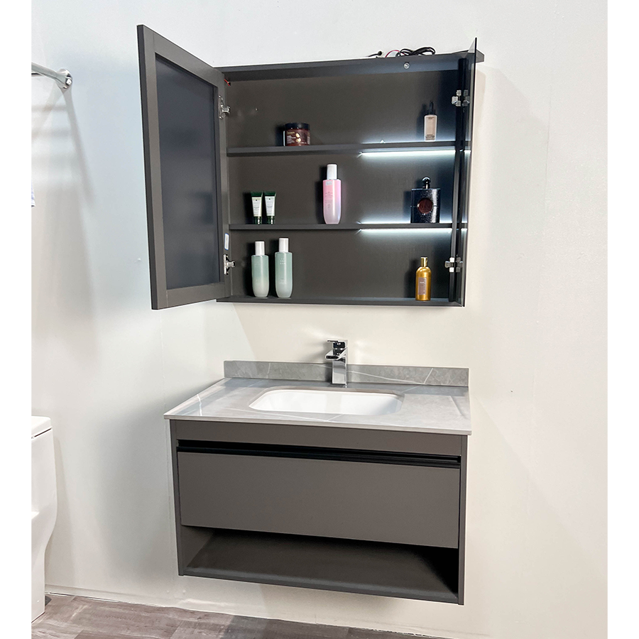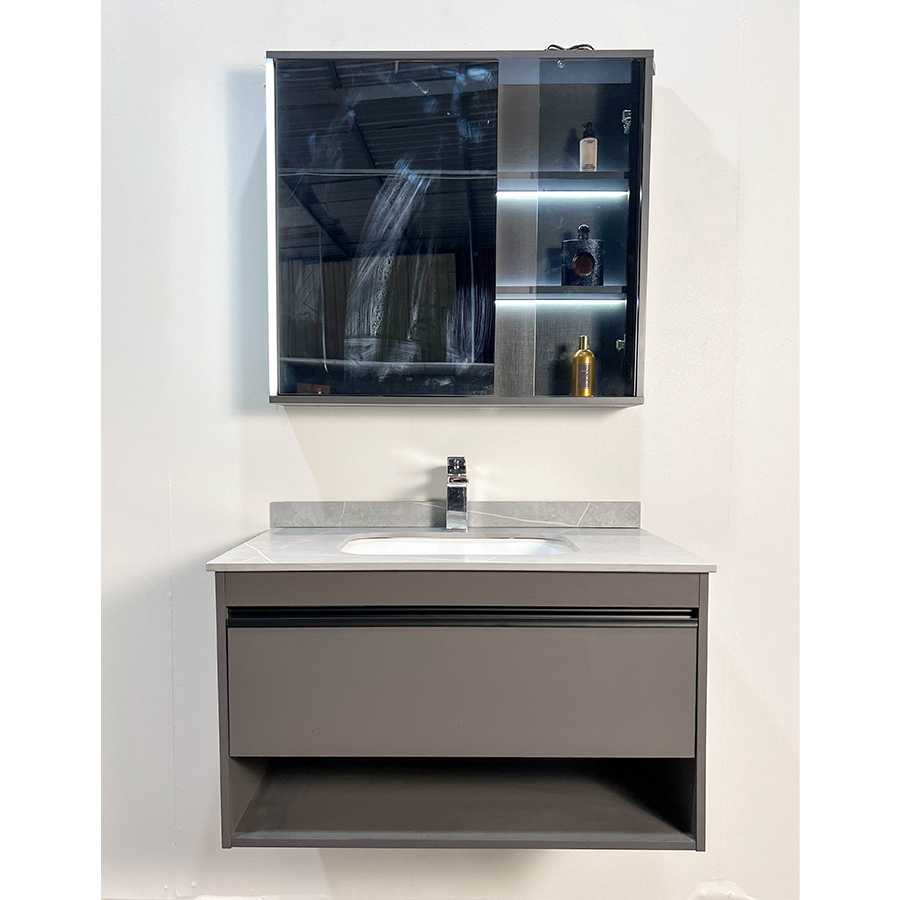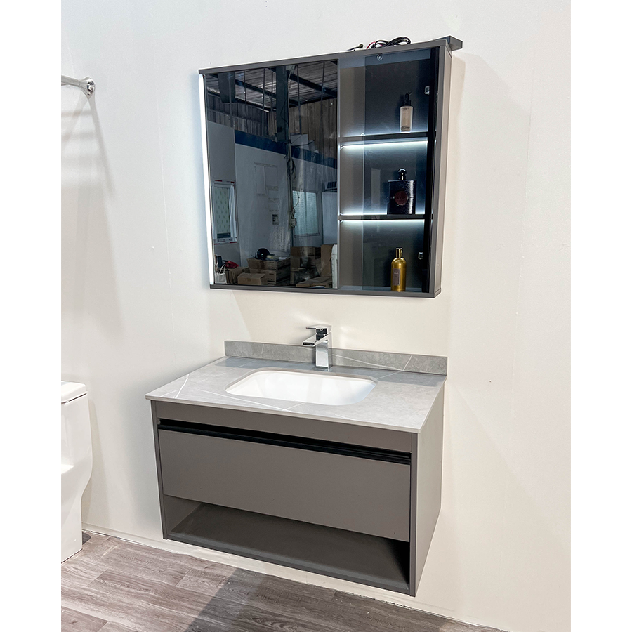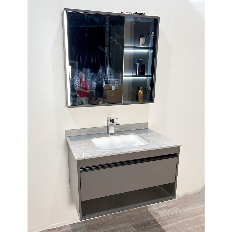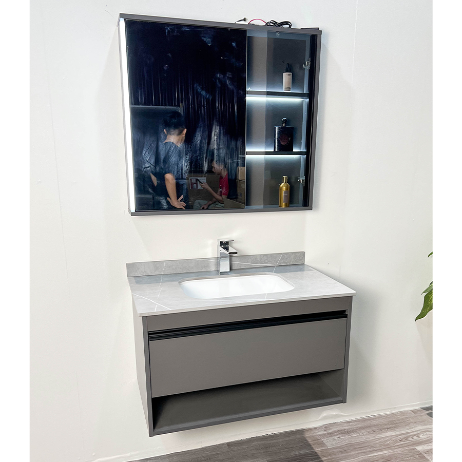 - Kích thước: *Tủ Chậu: 800*480 mm * Tủ Gương: 750*680 mm (LED SMART) - Chất liệu: Plywood E1 nhiệt đới hóa phù hợp với khí hậu châu Á, Kháng nước, chống mối mọt, không bị biến dạng cong vênh. - Mặt bàn chậu: Mặt bàn đá + chậu lavabo âm bàn đá, chất men Aqua Nano, chống bám bẩn, dễ vệ sinh. - Bản lề giảm chấn 304, Có chu kỳ đóng mở lên đến 500.000. - Tủ gương LED thông minh, cảm biến tự động bật tắt khi có người, chất liệu gương Phôi Bỉ chống ẩm mốc.