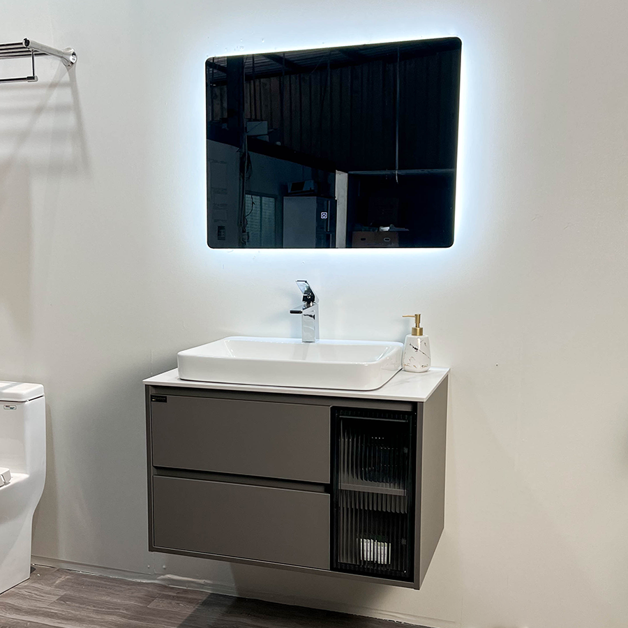- Kích thước: *Tủ Chậu: 800*500*490 mm * Gương: 800*600 mm (Touch Sensor) - Chất liệu: Plywood E1 nhiệt đới hóa phù hợp với khí hậu châu Á, Kháng nước, chống mối mọt, không bị biến dạng cong vênh. - Mặt bàn chậu: Mặt bàn đá + Chậu rửa đặt dương bàn đá, chống bám bẩn, dễ vệ sinh. - Bản lề giảm chấn 304, Có chu kỳ đóng mở lên đến 500.000. - Gương LED thông minh, cảm biến bấm chạm, chất liệu gương Phôi Bỉ chống ẩm mốc.