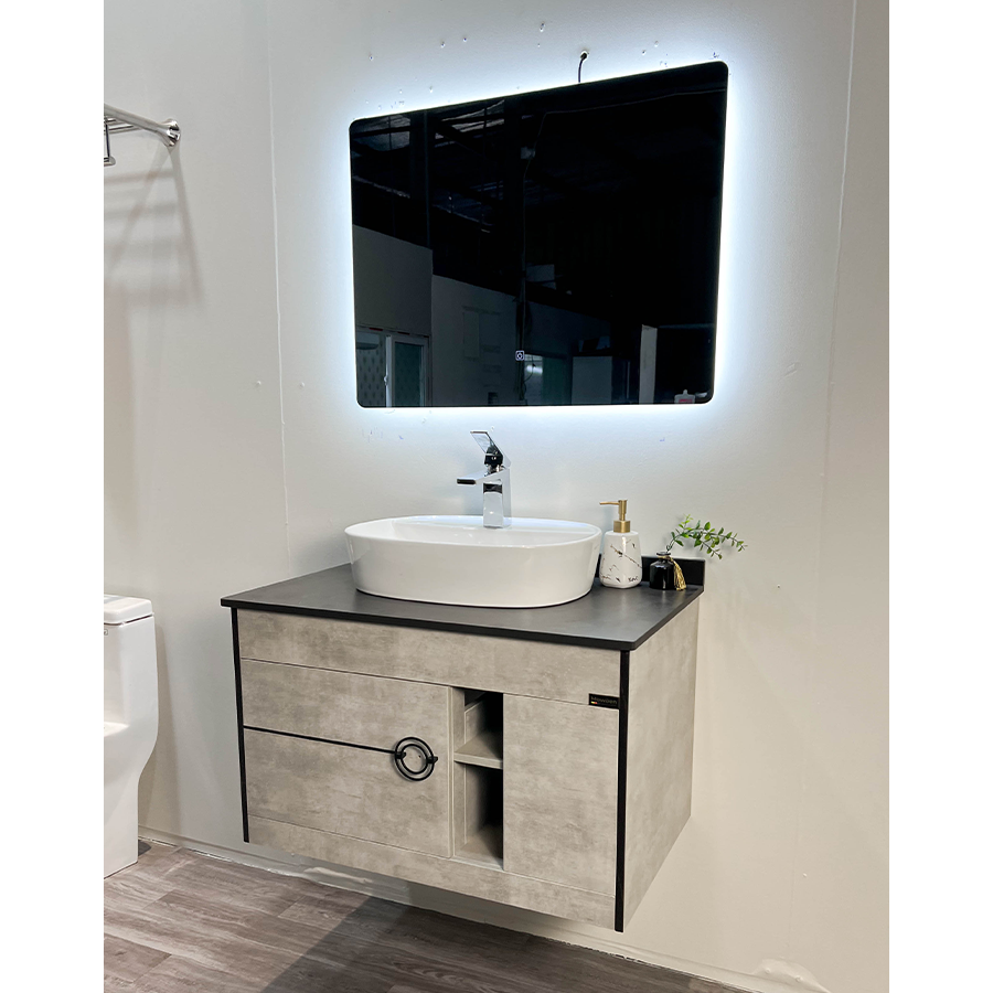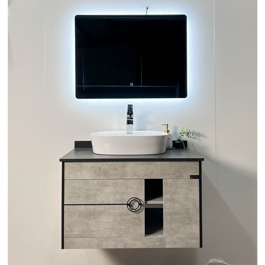 - Kích thước: *Tủ Chậu: 800*500*500 mm * Gương: 800*600 (mm) (Touch Sensor) - Chất liệu: Plywood E1 nhiệt đới hóa phù hợp với khí hậu châu Á, Kháng nước, chống mối mọt, không bị biến dạng cong vênh. - Mặt bàn chậu: Mặt bàn đá + chậu lavabo chất men Aqua Nano, chống bám bẩn, dễ vệ sinh. - Bản lề giảm chấn 304, Có chu kỳ đóng mở lên đến 500.000. - Gương LED thông minh, cảm biến bấm chạm, chất liệu gương Phôi Bỉ chống ẩm mốc.
