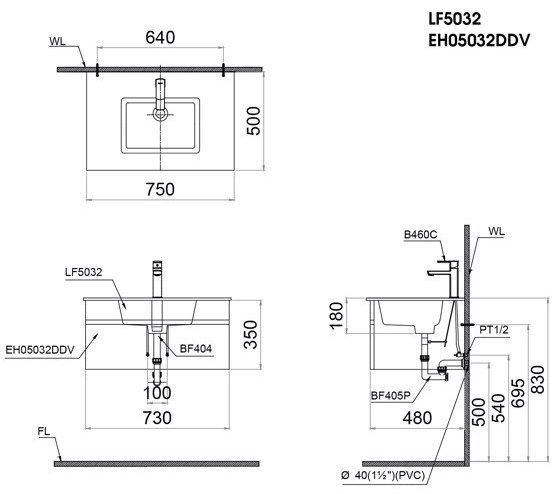 - Kích thước lavabo LF5032:500 x 750 x 180 mm (dài x rộng x cao)