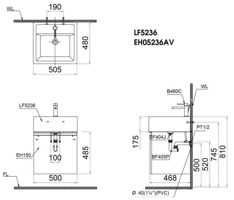 Tủ lavabo treo tường LF5236+ EH05236AV lắp đặt phù hợp với các vòi sau: B224C, B430CPW, B305C, B460C, B490CP, B370C, B680CT, B150CP...