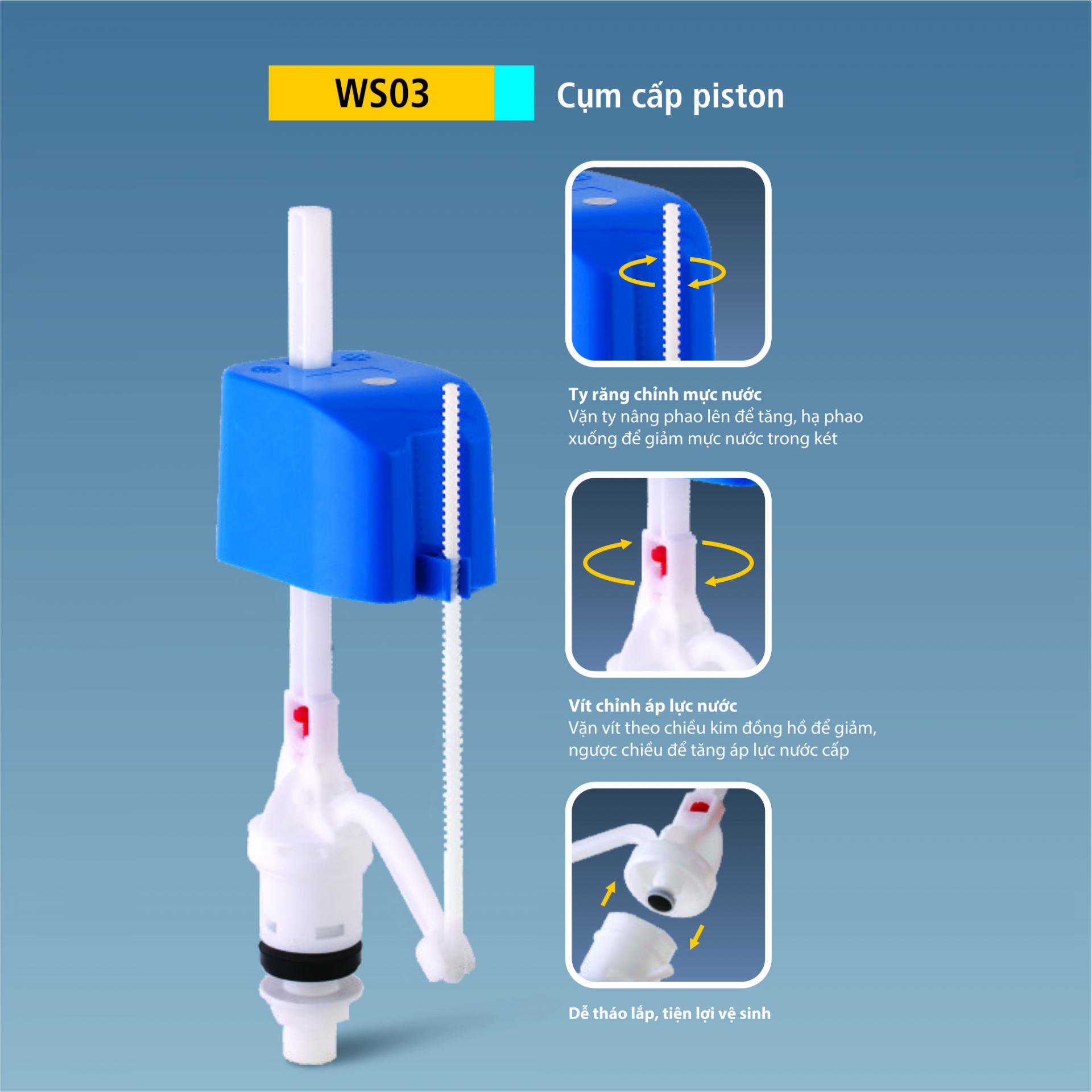 • Ưu điểm ty răng chỉnh mực nước vặn ty lên là tăng, hạ phao xuống để giảm mực mước trong két giúp tiết kiệm nước, trụ cấp nước dễ dàng tháo lắp thật tiện lợi khi vệ sinh bộ xả, các giăng cao su chống lão hóa giúp tăng độ bền