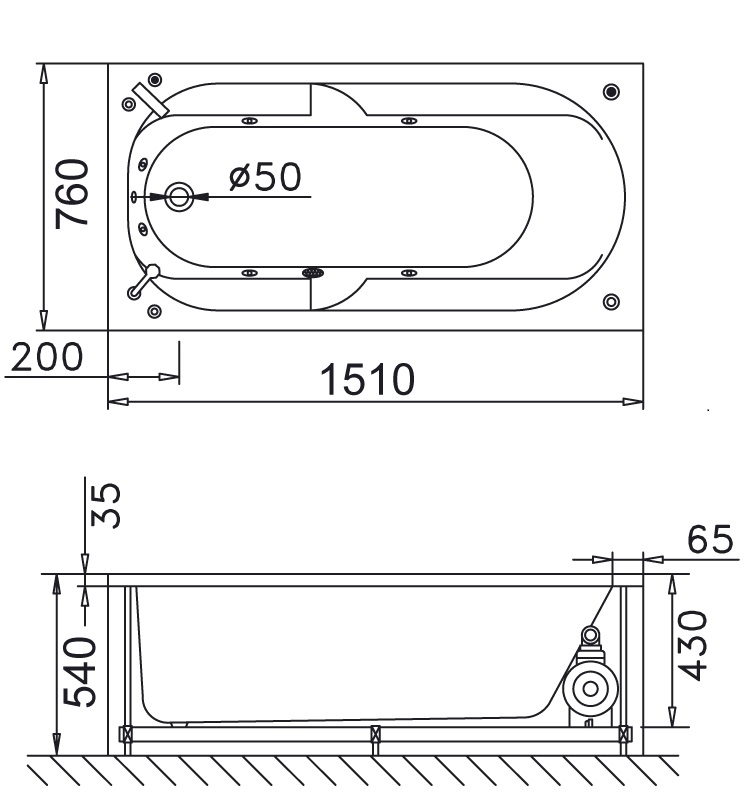 Bản vẽ kỹ thuật bồn tắm dài Caesar AT0250 1.5M
