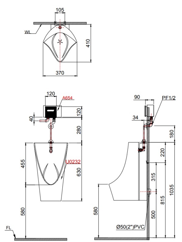 Bồn tiểu U0232 treo tường có thể lắp đặt với các van xả tiểu sau: BF412G, A652DC, A623, A624, A637, A648, A671, A672, A673 , A654