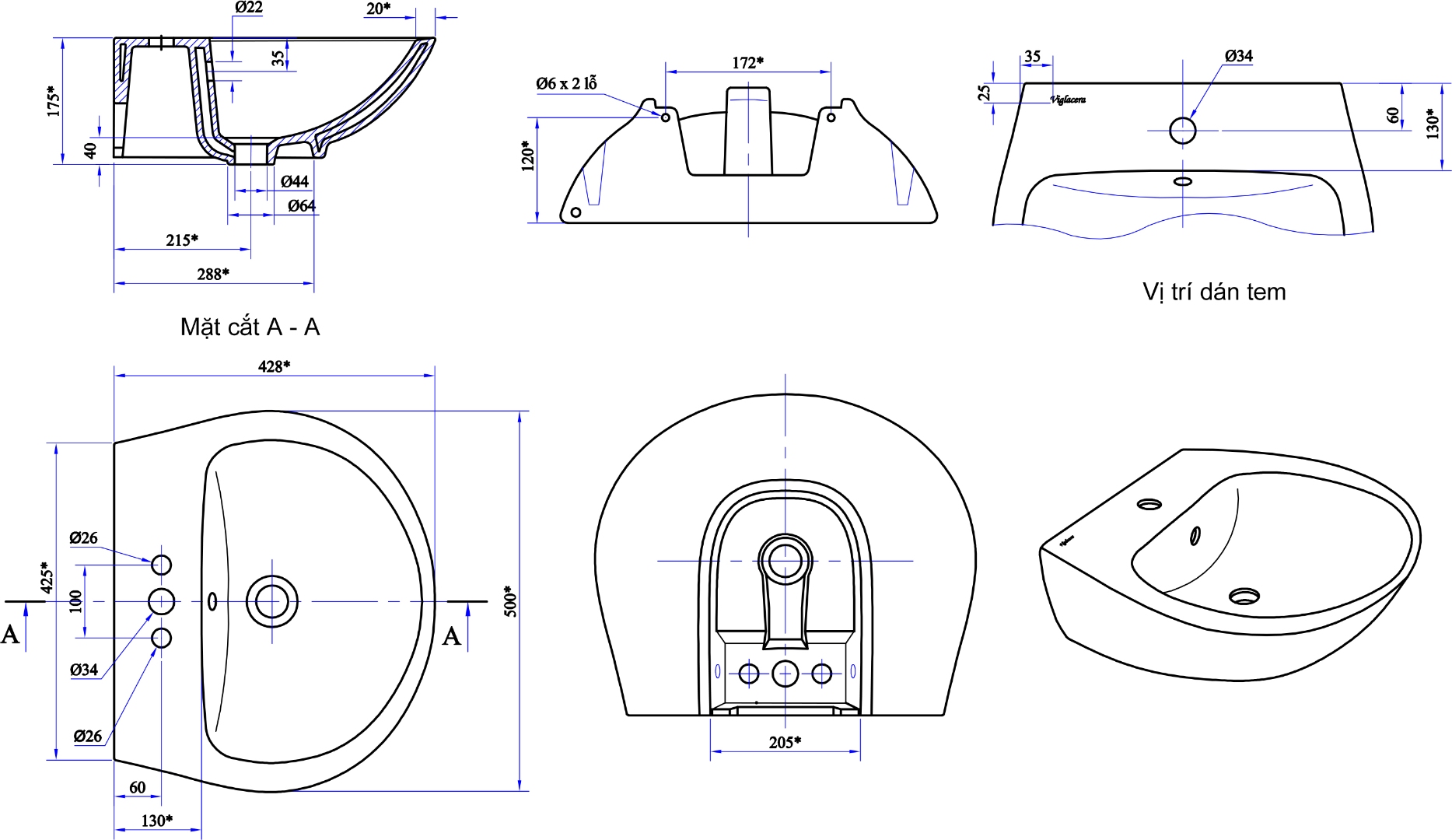 Lavabo Treo Tường + Chân Treo VIGLACERA V36