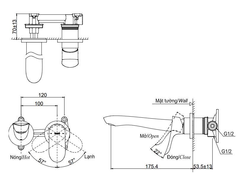 • Tên sản phẩm: Vòi chậu gật gù nóng lạnh gắn tường GO (2 lỗ)