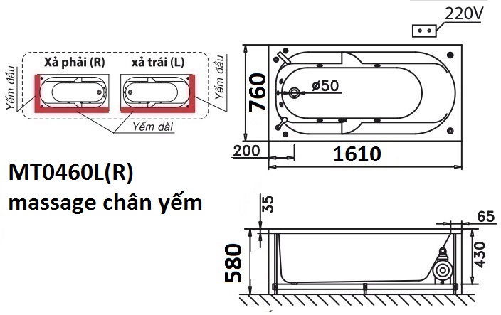Thông tin bồn tắm Caesar MT0460L/R massage chân yếm